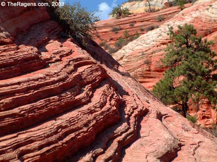banded patterns formed in the red rocks as I looked up this little side canyon.